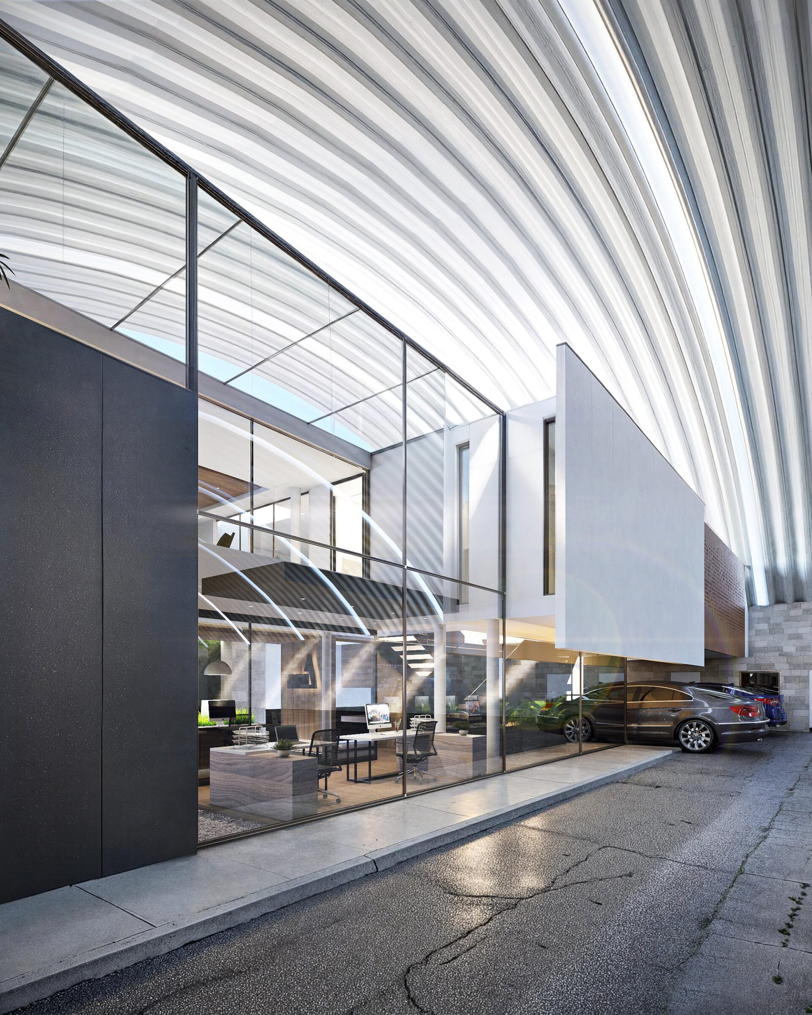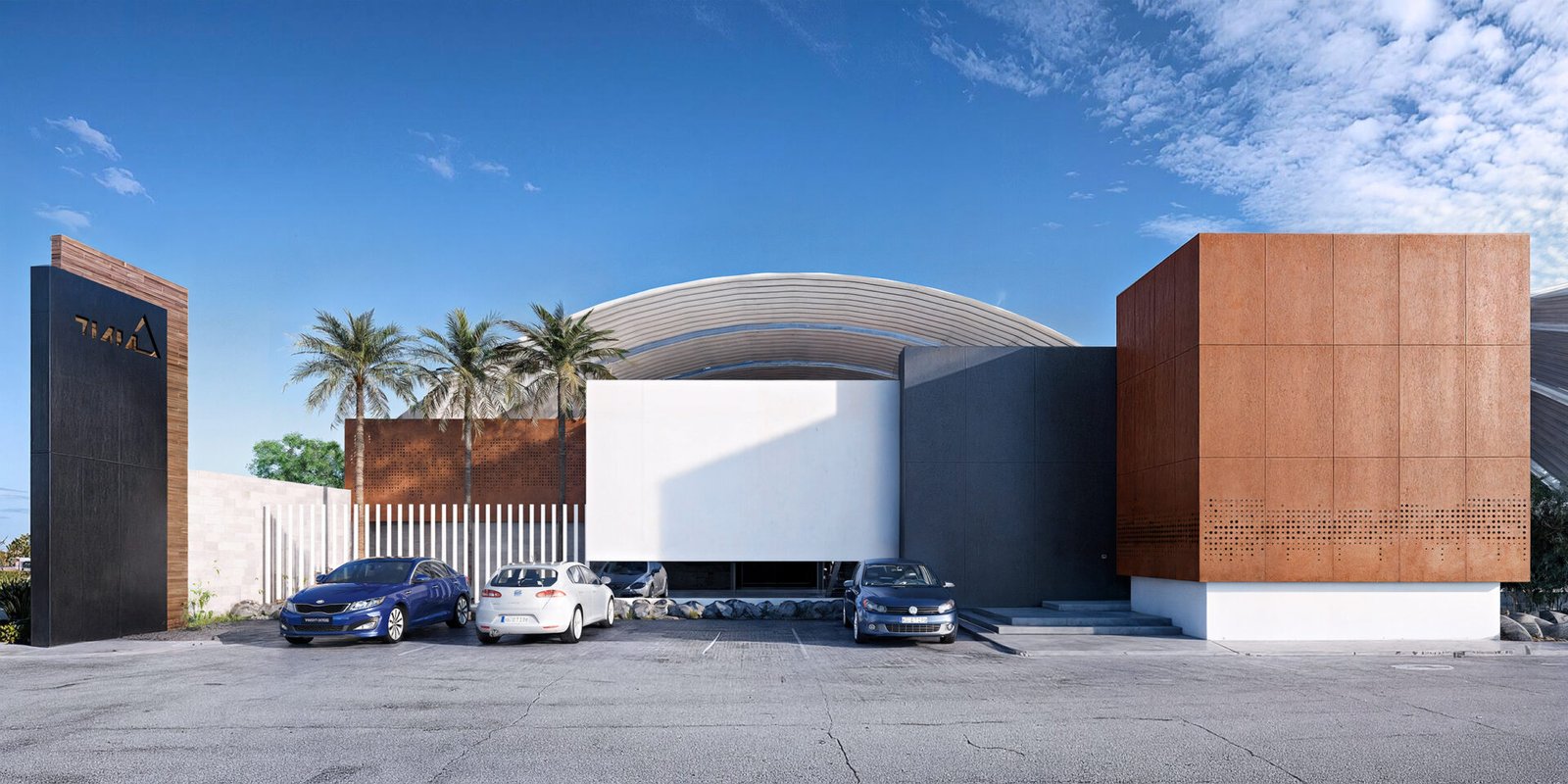 La fachada apuesta por el minimalismo industrial, resaltando formas básicas a través de un volumen protagónico revestido en láminas con acabado en óxido, proyectando una imagen de solidez y el uso de maderas en el interior que rinde homenaje a la naturaleza del negocio..