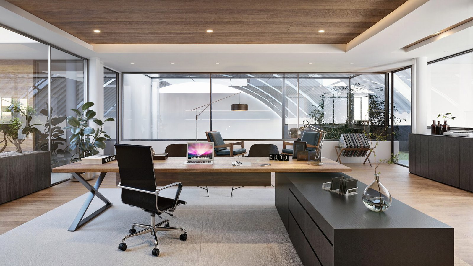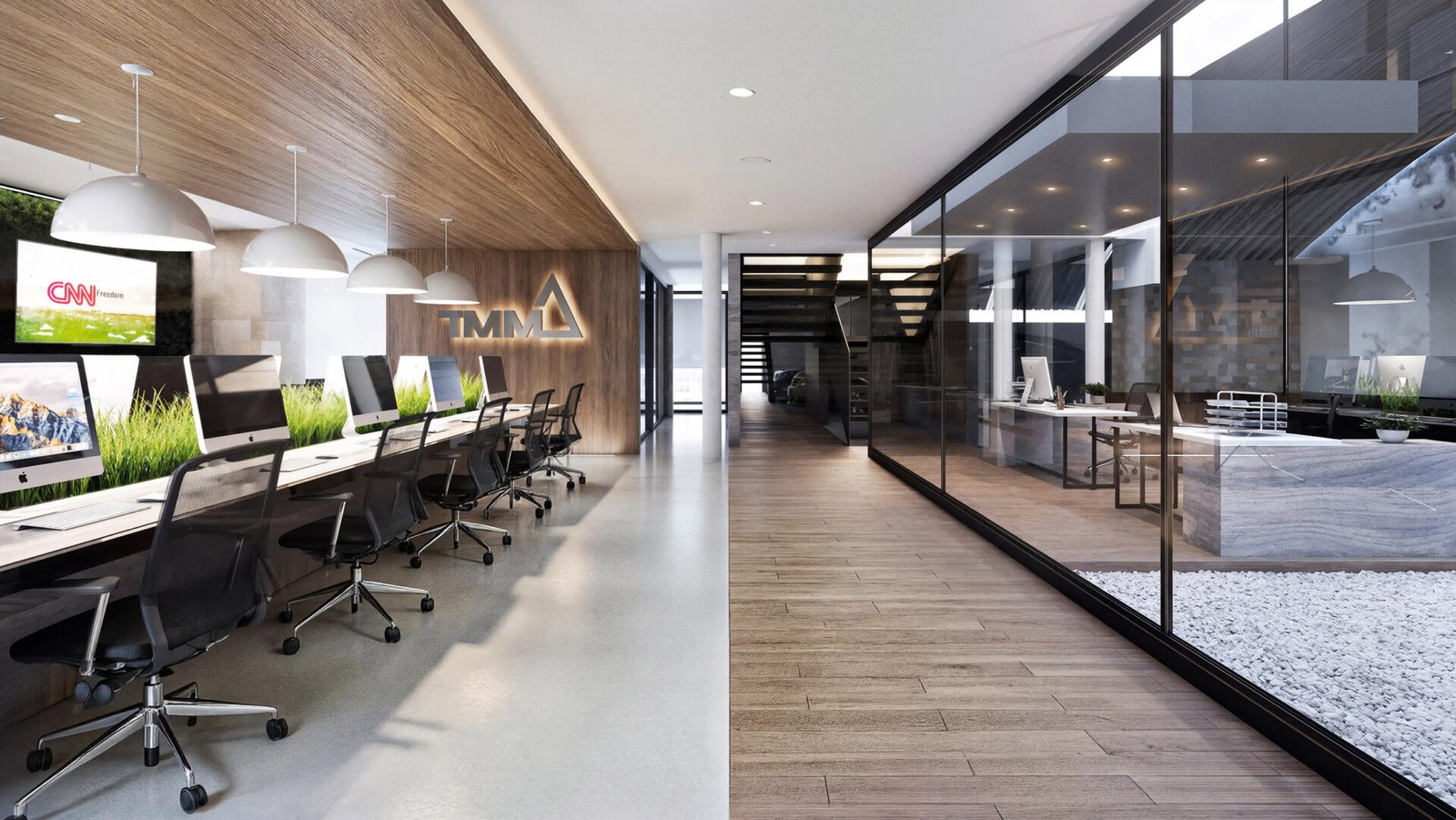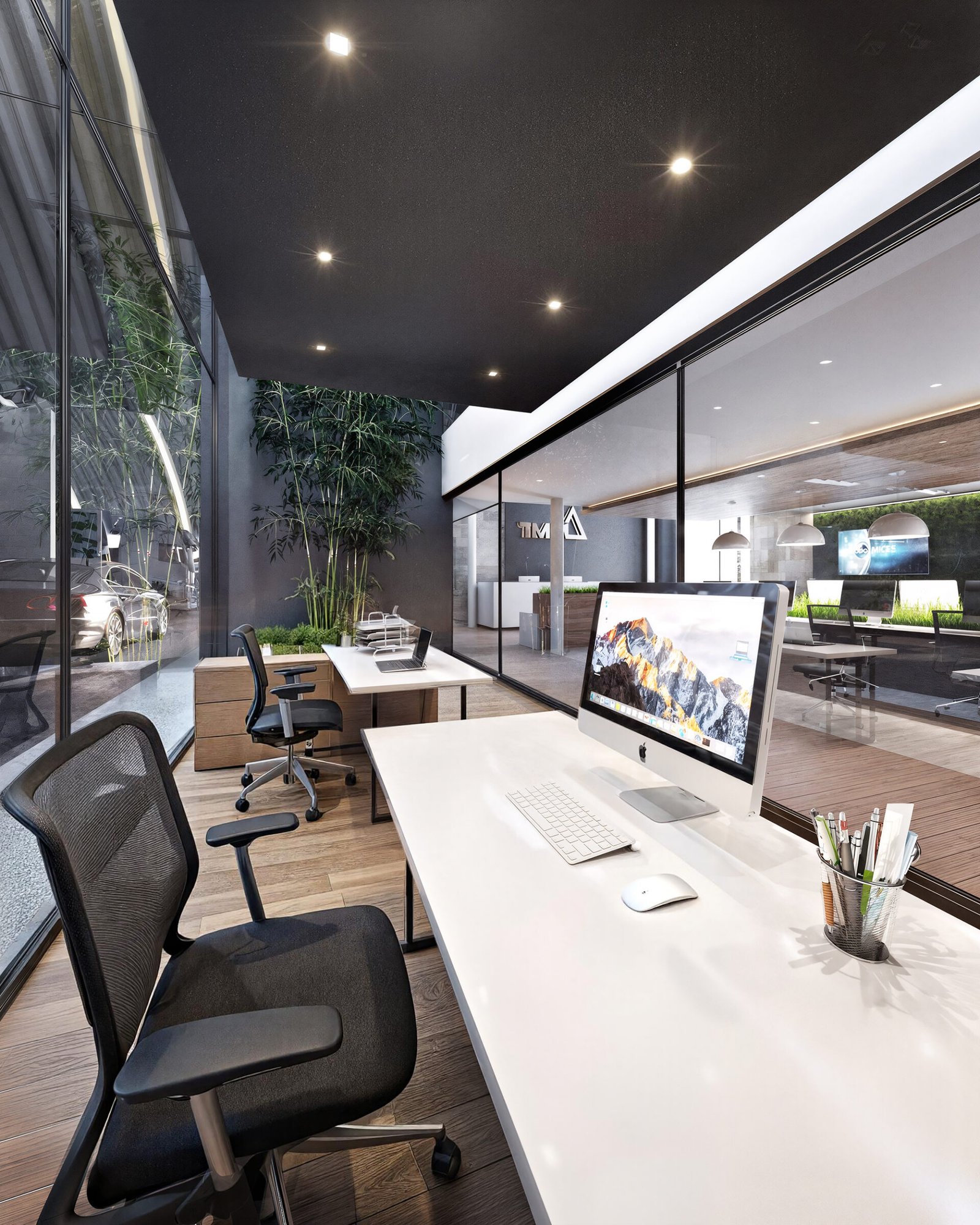 Para equilibrar la transparencia con la función, se diseñaron oficinas privadas con muros de cristal, garantizando aislamiento acústico sin perder la conexión visual, culminando en una oficina ejecutiva de alta jerarquía.