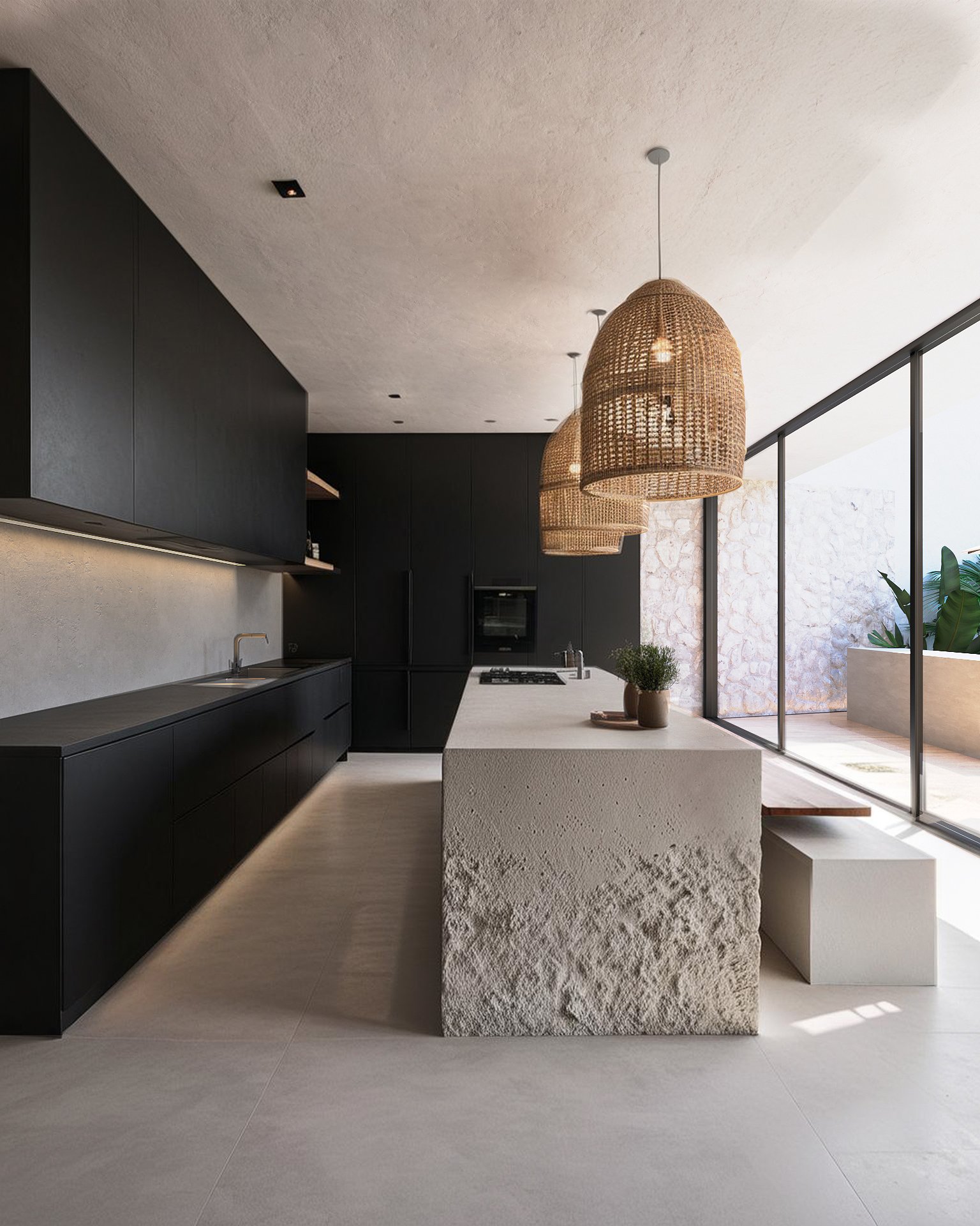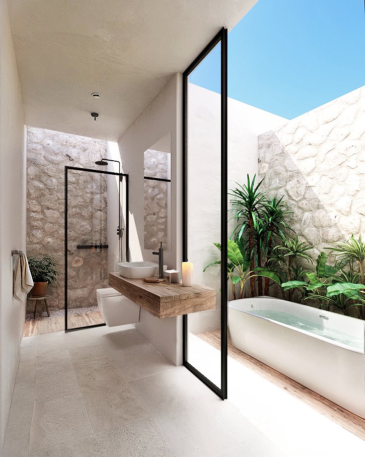 El uso de materiales como stuccos blancos y puros no es accidental; busca generar un contraste con materiales calidos como la madera que resalte la vibrante naturaleza del entorno y un cuerpo de agua turquesa para sentir frescura, logrando una pieza de arquitectura contemporánea que respira con el paisaje.