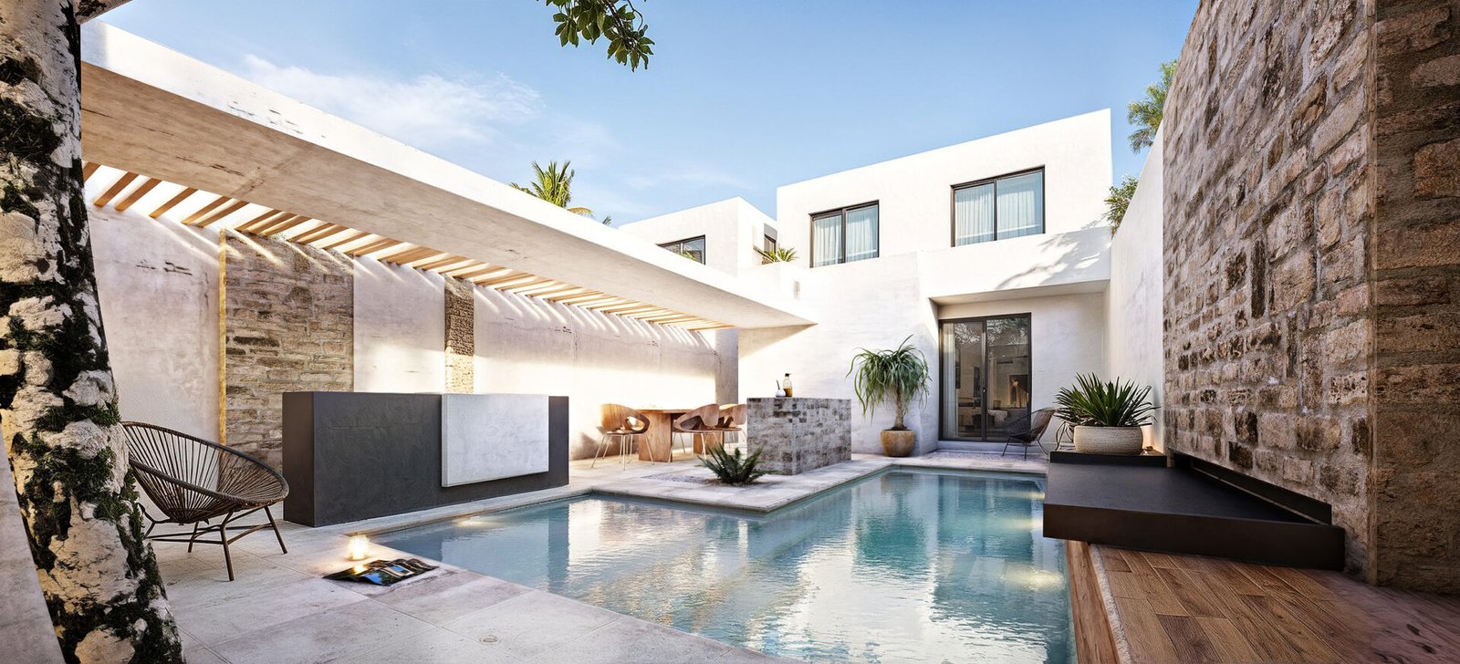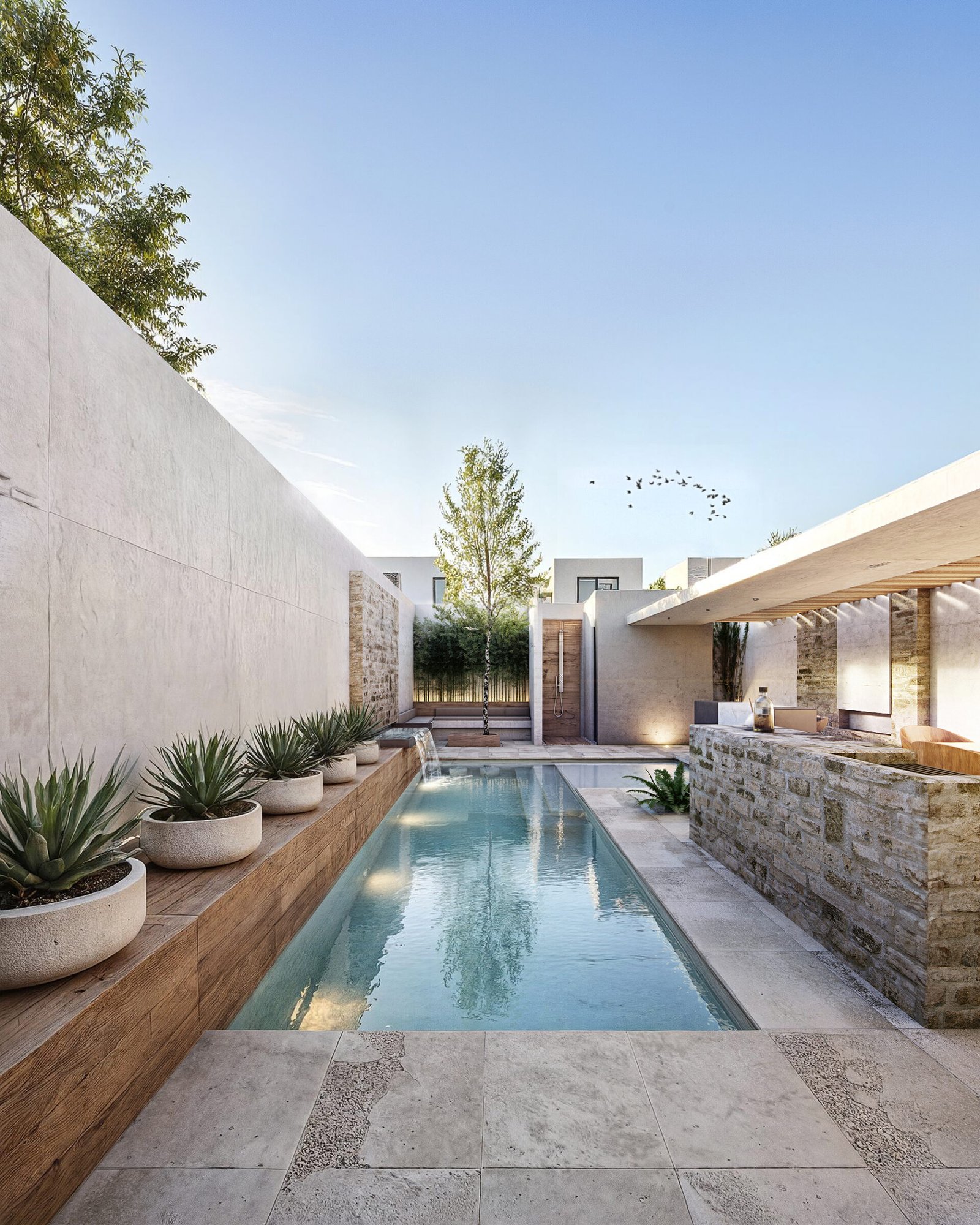 Esta remodelación y ampliación logra un hito arquitectónico al integrar dos patios posteriores de predios distintos en un solo pulmón social unificado. El proyecto transforma un espacio originalmente fragmentado en una zona común fluida que equilibra frescura, confort y minimalismo. La intervención se articula mediante líneas horizontales y materiales honestos como piedra, madera y concreto. Entre sus elementos protagonistas destaca una alberca longitudinal que funciona como área deportiva y espejo de agua, aportando serenidad acústica mediante una caída de agua integrada.